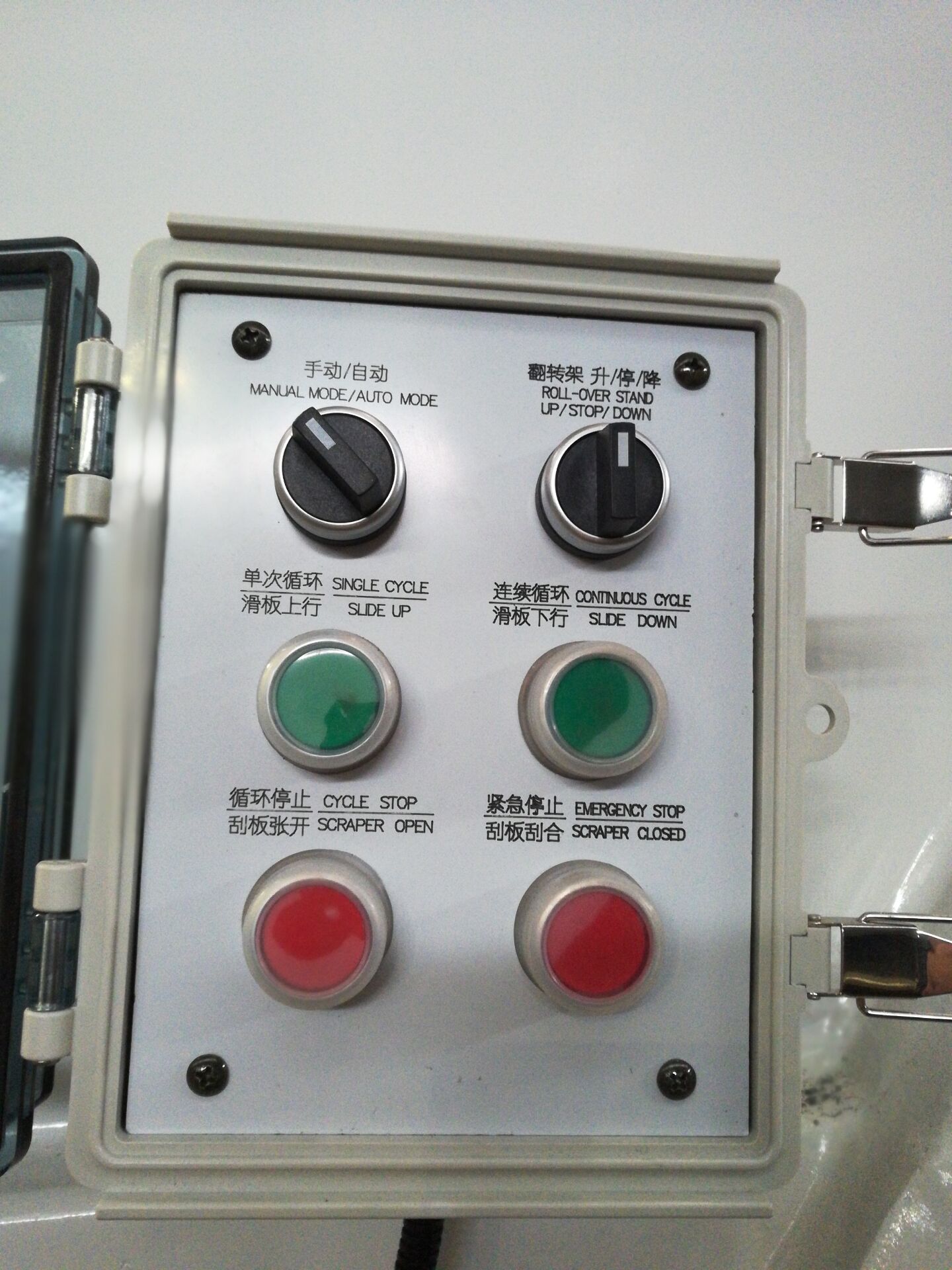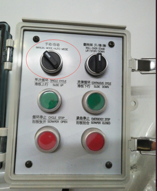 B、在自動模式.按下綠色單次工作按鈕,操作系統即自動完成一次滑板刮板向垃圾箱內轉移垃圾循環, ,如果垃圾斗里的垃圾多了, 可以選擇連續循環按鈕,垃圾轉移完畢.按下方紅色按扭停止。