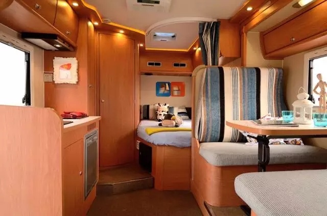 會客區,標準的雙人對坐卡座沙發,可供四人聊天聚餐。側面窗戶上方還置有兩個木質吊柜,可供存放物品。該區域在駐車時可拓展,增加車內空間。