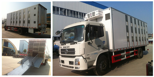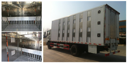 東風天錦7.6米豬仔運輸車箱體為全不銹鋼保溫結構,外部部分玻璃鋼飾板。