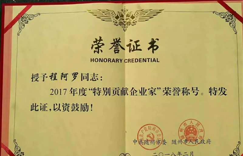 2月22日,隨州市市委、市政府在全省電視會(huì)議上表彰程力公司及程阿羅總經(jīng)理分別獲得特別貢獻(xiàn)獎(jiǎng)和特別貢獻(xiàn)企業(yè)家榮譽(yù)稱號(hào)。