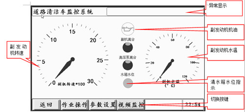 實時顯示清水箱水位狀態,顯示黃色時,水位已經到達低水位,只能進行洗車和清淤作業,請及時關閉清洗作業,顯示紅色時,不能啟動高壓泵進行任何有關高壓沖洗等作業(可單獨掃路)。