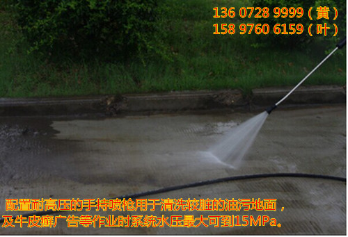 3、 配置耐高壓的手持噴槍用于清洗較臟的油污地面,及牛皮癬廣告等作業(yè)時系統(tǒng)水壓最大可到15MPa。