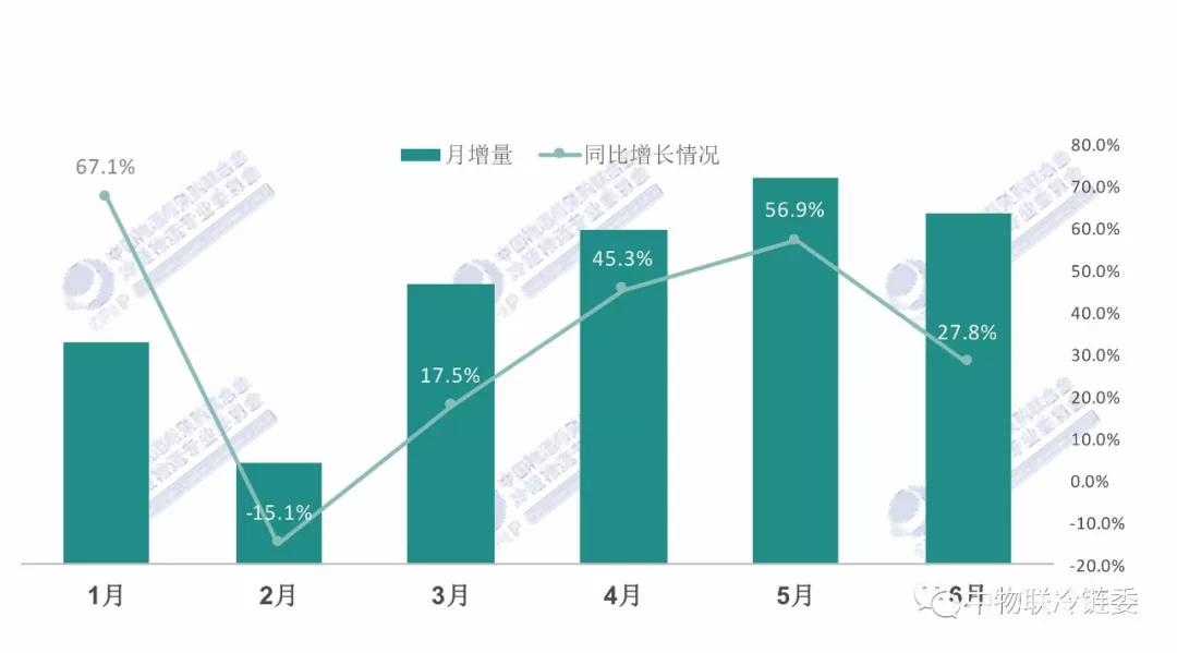 上半年,我國冷藏車市場增量十分可觀,冷藏車增長量約為18200臺,同比增長26.6%。其中,輕型冷藏車增長約11640臺,重型冷藏車增長約3750臺(含半掛車冷藏車約200臺),中型冷藏車約810臺,客廂式冷藏車約2000臺。增長量從3月份開始攀升,5月份達到峰值。
