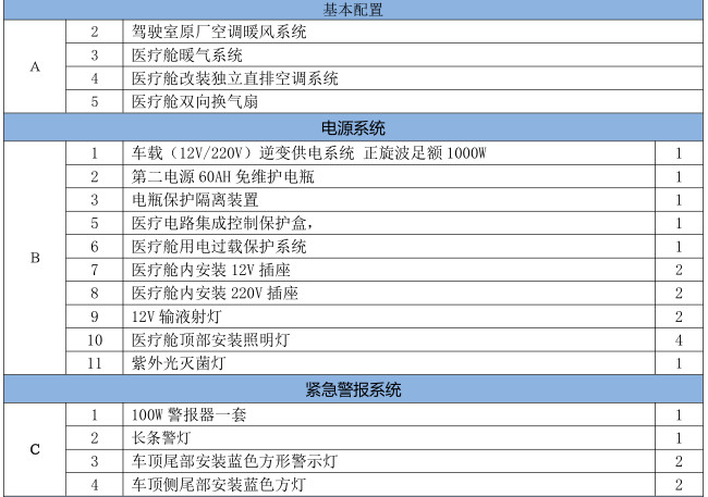 | 其它 | 選裝不同形式的頂部,及警燈、前額凸臺(tái)位置變化,前額凸臺(tái)選裝LED屏。分別對(duì)應(yīng)的高度為mm:2580、2810、2590、2360、2690。選裝車頂四周單個(gè)或多個(gè)爆閃燈。選裝換氣扇、側(cè)踏板、裝備醫(yī)療器械柜、氧氣瓶、擔(dān)架、輸液夾持器、消毒燈等專用裝置。選裝普通款大燈。可按照用戶行業(yè)要求噴涂或粘貼車輛外標(biāo)識(shí)及裝飾條。選裝的ABS系統(tǒng)生產(chǎn)廠家、型號(hào)分別為博世汽車部件(蘇州)有限公司、6C11 2M110 A*。 | ||