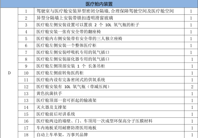 江鈴福特新世代 V348 長(zhǎng)軸中頂監(jiān)護(hù)型救護(hù)車配置參數(shù)表參考: