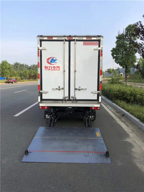 后部液壓尾板收起狀態離車輛最后端距離230mm。可選裝其它功率相同制冷機組。隨底盤選裝駕駛室。廂體頂部封閉,