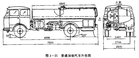 加油車通常由氣車底盤、罐體、油管、各種閥、各種工作儀表,過濾器、靜電消除裝置,軟管盤總成,加油槍及驅(qū)動裝置等組成。圖3-21為普通加油汽車外形圖。