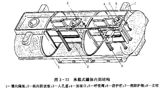 加油車的罐體與運油車的罐體相似,也具有運油車罐體的基本裝置。圖3-22為大型加油車罐體結(jié)構(gòu)示意圖。橫向隔板1將罐體分成三個艙,每個艙內(nèi)設(shè)有橫向防波板。罐體寬度較大時,可再設(shè)縱向防波板。2防護欄6和側(cè)防護架7是用來保護加油口,呼吸閥等不受意外碰傷,以免造成燃油外溢。大型罐體還可采用立柱8以提高罐體剛度。