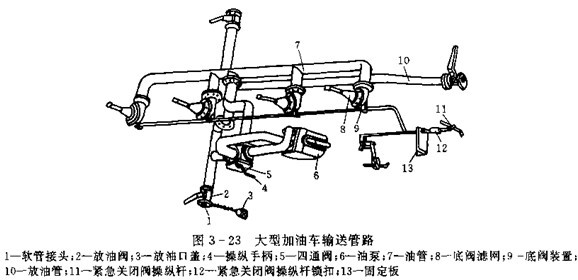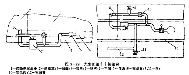 ①車架油路的布置。車架油路布置通常隨油泵位置而定。油泵位置應(yīng)盡量靠近動力源,縮短傳動距離,但要保證加油車的通過性能。油路一般沿車架平面布置,力求管路短,變曲少。圖3-29為一輛大型加油車的車架油路布置圖,由于油泵7是油汽車發(fā)動機驅(qū)動,所以油泵在汽車車架內(nèi)側(cè),靠近前部。油路按車架下平面布置。