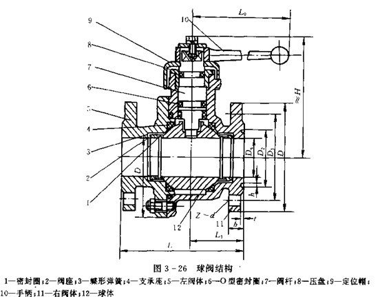 放油閥常用的有球閥、蝶閥等。目前各類加油車大多用鋁合金球閥,通徑¢25mm的球閥保留了原閘板閥的外部連接尺寸,通徑¢50mm、¢65mm、¢80mm、¢100mm四種規(guī)格的球閥主要尺寸列于表3-2,結(jié)構(gòu)如圖3-26所示。這樣,與管道的連接法蘭尺寸都可實現(xiàn)標準化,軟管接頭和接頭閥亦采用國際通用的通徑¢63.5mm(¢2.5in).