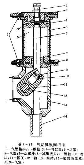 放油閥的操縱形式有手動,液動,氣動和電動等,根據(jù)總布置要求確定,手動形式簡單,在無特殊要求時,一般采用手動,為提高機械化程度,也可采用液動或氣動,液動力源可取本車動力轉(zhuǎn)向系統(tǒng)的壓力油液,氣壓源可取本車制去氣源。電動形式容易引起火災(zāi)。圖3-27為氣動操縱閥的結(jié)構(gòu),用來操縱放油閥或其它的控制閥,當(dāng)氣室A充氣,氣室B排氣時,空氣壓力推動活塞4通過活塞桿6滑塊10使拔叉11轉(zhuǎn)動,于是轉(zhuǎn)軸12使放油閥(控制閥)開啟或關(guān)閉。