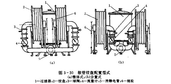 操縱室油路的布置主要決定于操縱室的大小及兩絞盤的配置型式。兩絞盤的配置型式有整體式和分置式兩種,圖3-30(a)是責(zé)人絞盤集中配置的整體式配置型式,流量計,閥門等布置在絞盤兩側(cè),來自車架油路的油液經(jīng)過濾器,消靜電管后由中間向外側(cè)分左右兩路進入絞盤軟管,這種布置的優(yōu)點是絞盤結(jié)構(gòu)簡單,緊湊,但流量計和閥門在兩側(cè),不便于觀察和操縱。圖3-30(b)是兩絞盤分開配置的分置式配置型式,油液經(jīng)過濾器,消靜電管后分兩路自兩絞盤內(nèi)側(cè)進入絞盤軟管。這咱布置優(yōu)點是流量計和閥門集中在絞盤之間,便于觀察和操縱。