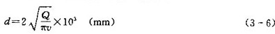 (4)管道內(nèi)徑計算,當(dāng)管道流量Q確定后,其內(nèi)徑d由下式表式: