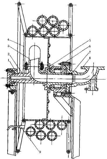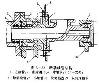 (3)轉(zhuǎn)動軸管設(shè)計,轉(zhuǎn)動軸管是轉(zhuǎn)動油管與小軸管(見圖3-31)的合稱,為絞盤總成的重要部件。在轉(zhuǎn)動軸管結(jié)構(gòu)設(shè)計時,即要考慮管路密封,不寧考慮其支承絞盤,起到轉(zhuǎn)動軸的作用。圖3-33為轉(zhuǎn)動軸管的結(jié)構(gòu),由轉(zhuǎn)動油管6和小軸管7組成,中間用法蘭聯(lián)接。軸管的一端伸入進油管1( 固定管)兩者以有相對轉(zhuǎn)動,用密封圈密封,另一端支承在支架上。這種設(shè)計,與整體結(jié)構(gòu)(中間取消法蘭聯(lián)接)相比,最大優(yōu)點是改善了轉(zhuǎn)動軸管的制造工藝性。