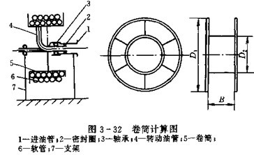 (2)卷筒尺寸的確定,為延長軟管使用壽命,卷筒寬度B根據(jù)操縱室的空間位置進行確定,一般情況用下式計算(見圖3-32):
