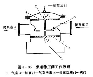 為旁通穩(wěn)壓閥的工作原理圖。氣室1內(nèi)充有一定壓力的空氣,上部油室2與泵的出口高壓油相通,氣室活塞3、油室活塞4與閥門5連成一體。在泵正常工用壓力下,氣室的氣體對活塞3的推力F1與油室油液對活塞4的推力F2相等,閥門5關(guān)閉不動,當(dāng)泵出口壓力升高時,油室的壓力隨之升高,F(xiàn)2> F1,活塞在力F=F2-F1的作用下推動閥5下移,閥門被打開,泵的出口與入口油路接通,系統(tǒng)壓力被打開,泵的出口與入口油路接通,系統(tǒng)壓力開始下降,直至恢復(fù)原工作壓力,閥門又呈關(guān)閉狀態(tài)。