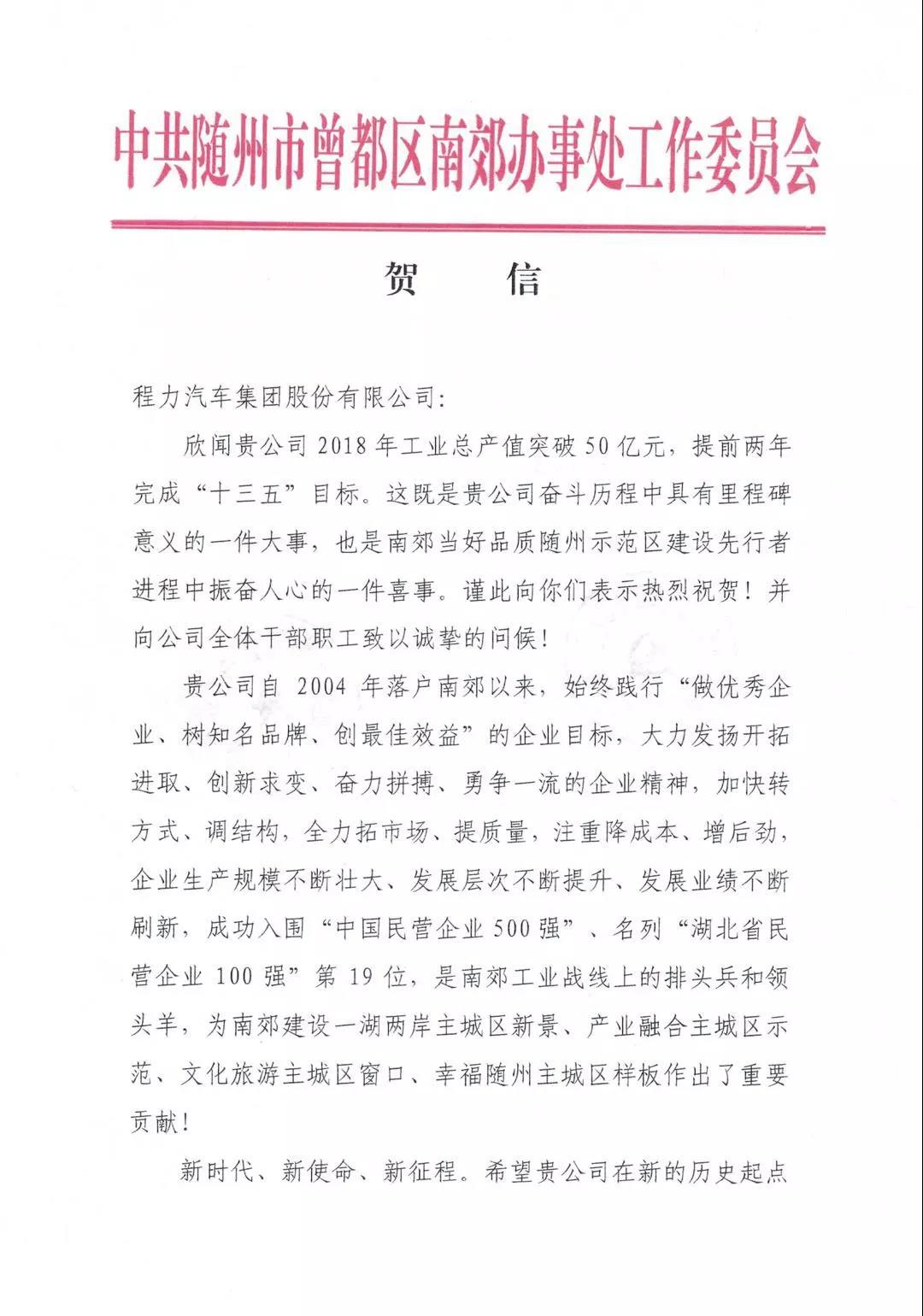 這不是一張簡單的賀信,這是一份擔當和責任,更是一種智慧和實力的展現。程力人從2015不到20億元,到2017年突破36億元,程力用2年時間基本實現產值翻番,而過去的2018年,程力人在新經濟、新常態下,實現逆勢穩步增長華麗轉身,提前2年完成了“十三五”制定的目標,確實可圈可點,值得思索點贊;同時,這也是一份期待已久驚喜和祝福,更是一份鞭策與鼓勵。