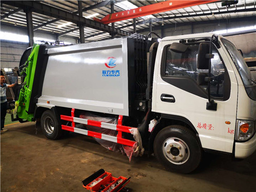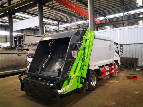 國五江淮康鈴后裝式壓縮垃圾車上裝壓縮箱體容積5立方, 弧形廂體。采用國標(biāo)錳鋼板制作,邊板4mm底板4mm.采用國內(nèi)著名品牌油缸、高密度高壓油管、多路閥和油泵,帶掛桶翻轉(zhuǎn)。帶PLC一健控制操作.車廂油漆顏色墨綠/墨灰色。