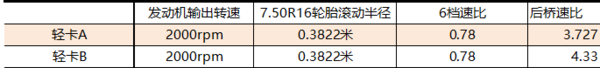 舉例說明,假如同一款輕卡,分別是輕卡A和輕卡B,配置7.50R16子午線輪胎,萬里揚WLY6T120手動變速箱,具有6個前進檔和一個倒檔,最高速為超速檔,檔位速比為0.78,輕卡A的后橋速比為3.727,輕卡B的后橋速比為4.33。