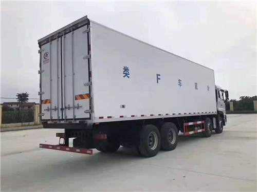 東風天龍前四后八廂長9.4米冷藏車保溫廂體配置: 車廂內尺寸 (長x寬x高)mm: 9400*2440*2450,冷藏廂體采用內外飾玻璃鋼;中間夾層保溫材料采用聚氨酯切片真空負壓一次復合成型;厚度8cm, 符合國家衛生部頒布食品等級要求,具有強度高、耐腐蝕、抗老化、導熱性能低、無污染、不容易損壞等特點,底板為鋁合金防滑花紋板,保證底板保溫性能及底板的抗沖擊強度。雙后開門門框架全部采用玻璃鋼制成的整體框架,門板重量輕,防腐性能好。雙后門中縫帶斜度,開關方便。門邊框密封采用進口優質橡膠(三元乙丙)密封條進行密封,保證廂體保溫效果的穩定性,門邊,門鎖及附件均為不銹鋼制作。