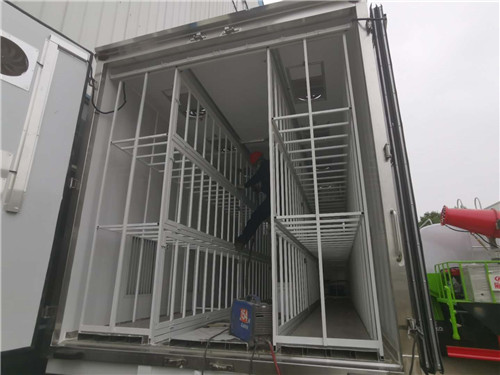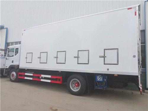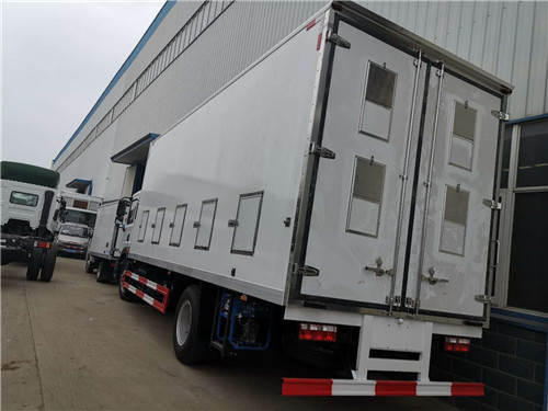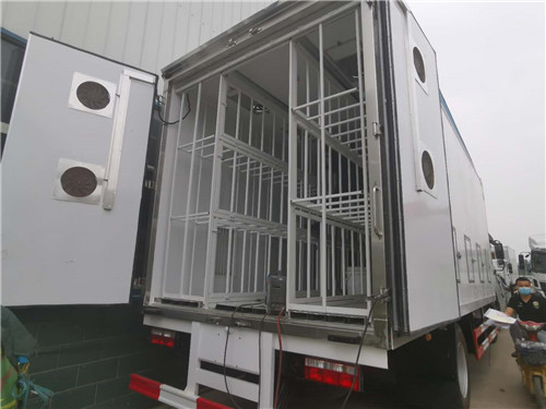 雞苗運輸車:屬于在冷藏車的基礎上衍生的一種車型,一般常用于運送雞苗、鴨苗、鵝苗等體積比較小的家禽、相比冷藏車更注重箱內的通風型,保證活體家禽有一個良好的運輸環境,廂體采用內外玻璃鋼板制作,中間8CM厚保溫板,鋁合金型材包邊,門框、門鎖件為不銹鋼,底板為鋁花紋板,廂體左右兩側各加裝多個百葉窗,廂體前板上方加裝2個百葉窗,后門上方加裝2個帶滑門帶電風扇的百葉窗,廂體頂板加裝帶風扇的天窗,廂體兩側各加裝一排可折疊貨架,廂體內兩側上方各加裝一排通風道,廂體底部加裝通風道,安裝冷機組和水溫加熱器,其余標配。下面就一些車型外形展示如下: