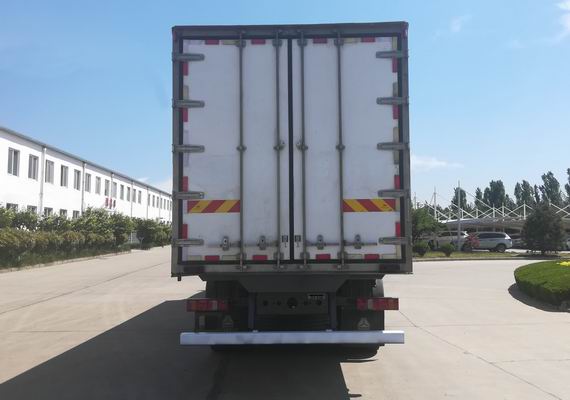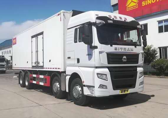 國六重汽汕德卡前四后八9.5冷藏車整車型號ZZ5326XLCV466HF1K型冷藏車,底盤型號ZZ1326V466HF1K,總質量(Kg):32000,額定載質量(Kg):17770,17705,整備質量(Kg):14100,駕駛室準乘人數(人):2,3,貨廂尺寸(mm):9450×2400,2450×2450,2500,2600mm,外形尺寸(mm):12000×2600×3980mm,國六重汽汕德卡前四后八9.5冷藏車圖片展示: