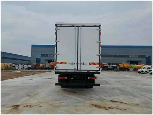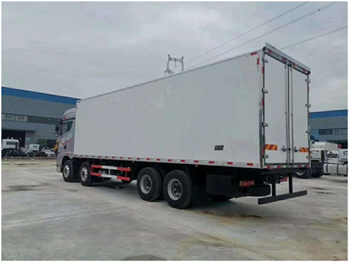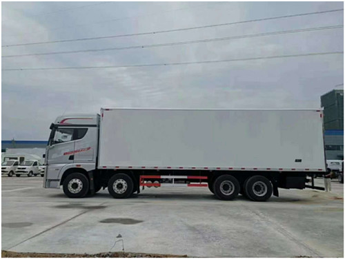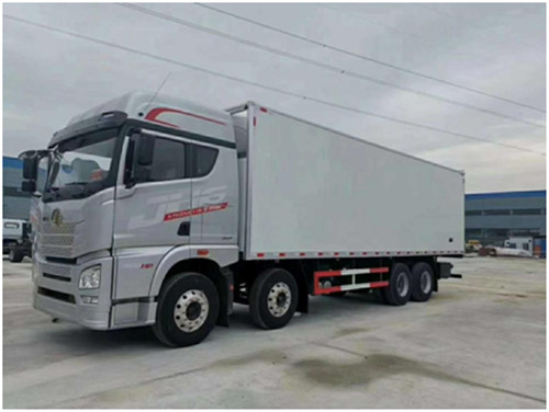 一汽解放JH6 前四后八冷藏車上裝配置:箱體為內外玻璃鋼板,中間保溫材料為8cm聚氨酯保溫板,鋁花紋底板,箱體邊緣采用鋁合金型材包邊,配雙開后門,單開側門,不銹鋼門框、鎖件、鉸鏈,其余標配。