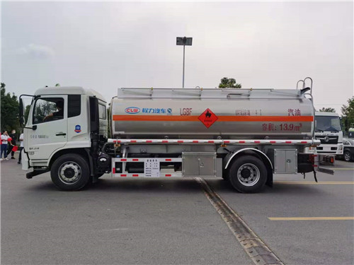 東風(fēng)天錦14方鋁合金運(yùn)油車整車型號CLW5181GYYLD6型鋁合金運(yùn)油車,底盤配置:東風(fēng)天錦國六原廠底盤,康明斯210馬力發(fā)動機(jī),275/80R22.5真空胎,帶空調(diào),前橋盤式制動、限速裝置,電動門窗,ABS,帶后橋空氣懸掛。
