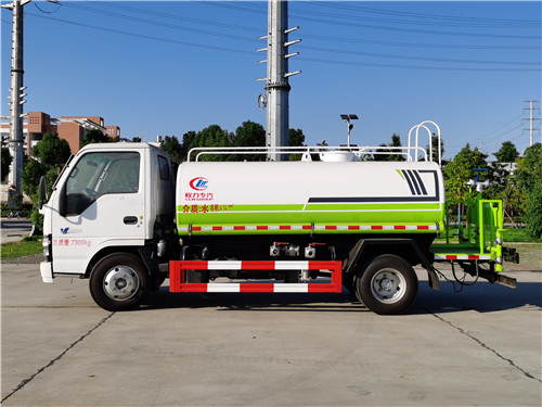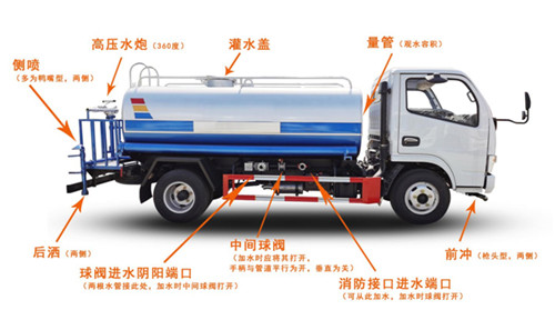 我公司生產灑水車,標配前沖、后灑、側噴、后置式工作平臺、平臺上有高壓水炮(可360°旋轉,可調成柱狀最大射程35米,也可調成霧狀最大射程15米,可調成:直沖狀、大雨、中雨、小雨、毛毛雨),配備優質大功率專用灑水泵,取力器,雜物過濾網,國標通用65型消防接口(可通過消防栓加水)、1套自流球閥系統(可自吸自排,可從河里或池塘抽水到罐體,最大吸程7米),2根引水鋼絲膠管。水泵、取力器、球閥、濾網均為國家標準產品,主管道加粗,法蘭墊、法蘭盤加厚,萬向前沖,大通徑球閥,具有性能優良,工作可靠、效率高、流量大、維修方便等特點。