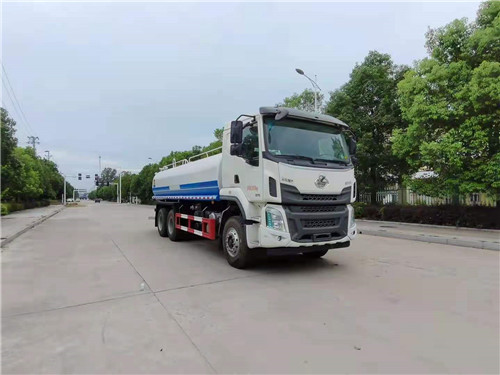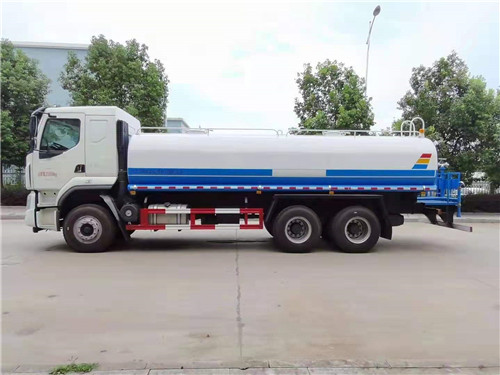 高端東風柳汽6×4灑水車 上裝配置: 罐體容積約18方,罐體用5MM碳鋼板制作,罐內隔板具有防波作用,以減低汽車行駛時罐體液體的沖擊。整車帶一個專用灑水泵50/110(垂直最大吸程6米),灑水寬度14米,射程28米。多功能灑水車配備2個前沖(噴)(能將路面泥巴、塵土、垃圾沖干凈);2個后灑(能均勻地將水灑在路面,一次灑水寬度14米)、2個側噴(花灑)(能均勻地將路旁綠化帶澆灌)、帶1個后工作平臺,平臺上安裝1個綠化灑水高炮(灑水炮可全方位旋轉,可連續調成直沖狀、大雨、小雨、毛毛雨,霧狀可調節沖洗高大樹木),引水時間<5min,流量90m3/h。帶1個消防接頭,帶1個自流閥,1個過濾裝置、人性化爬梯及側防護欄,安裝灑水音樂喇叭。