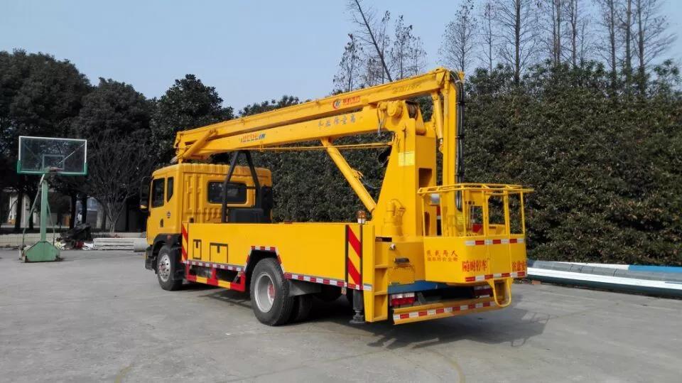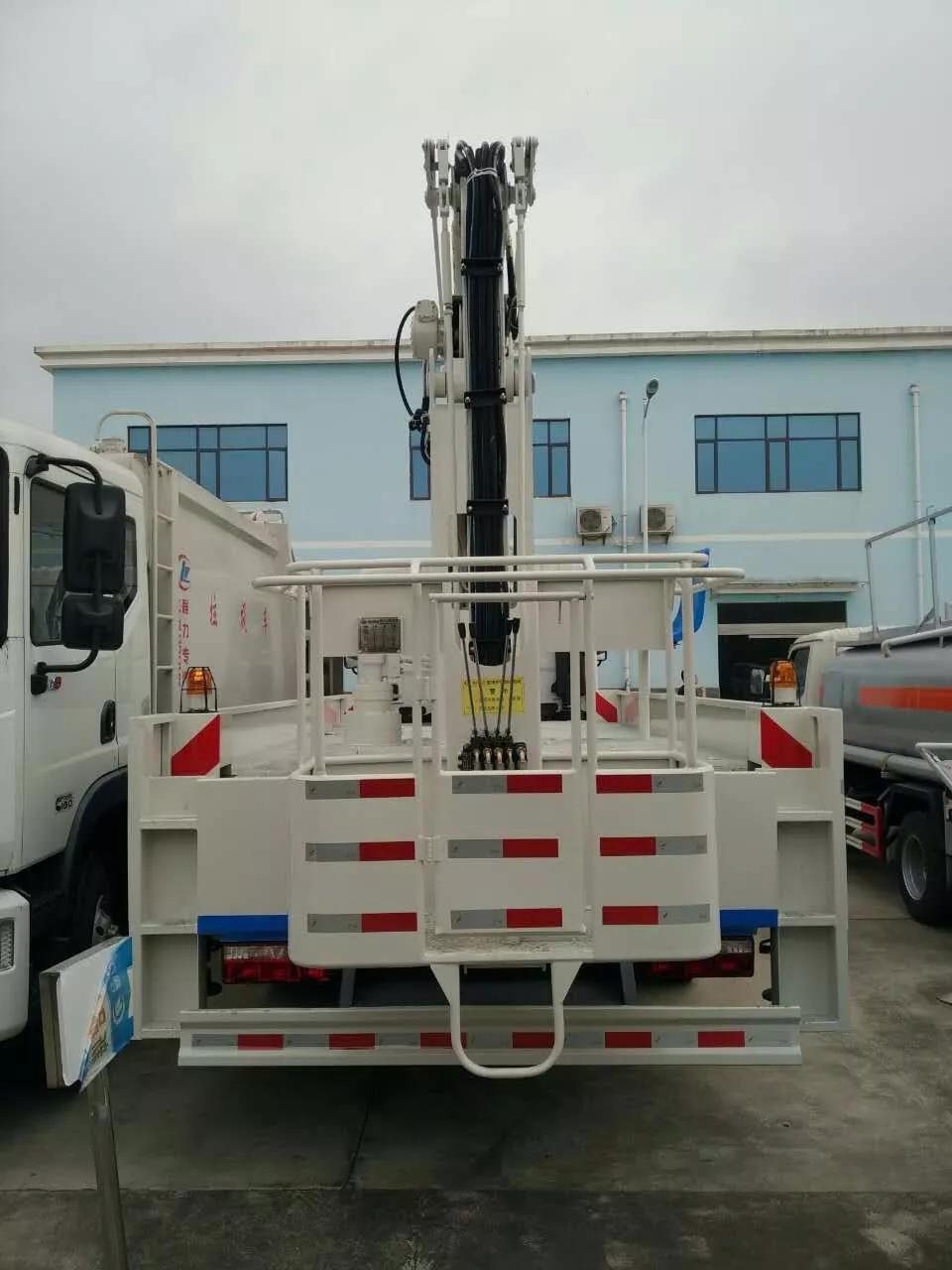 東風D9型22米高空作業車采用折疊式曲臂結構,作業臂為三節折疊式,工作斗和轉臺雙工作位,上下操作,電液控制,可360度回轉,四液壓支腿,工作斗內可控制發動機啟停,大臂帶卷揚吊鉤系統,吊鉤吊重≤900kg,載人工作斗承重200公斤,鋼制工具箱和花紋防滑走臺板,不銹鋼圍欄。