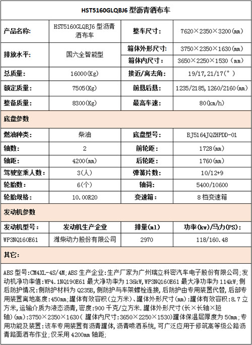福田瑞沃國六全智能型4200軸距瀝青灑布車上裝配置: