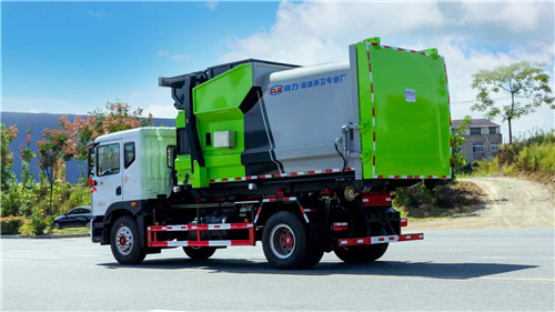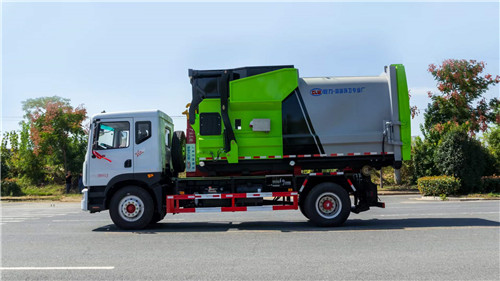 國六東風D9套臂車廂可卸式垃圾車整車型號:CL5180ZXX6GH,底盤型號:EQ1185LJ9CDE ,4500軸距,玉柴200馬力發動機,10.00鋼絲胎,8檔變速箱。國六東風D9套臂車廂可卸式垃圾車圖片展示: