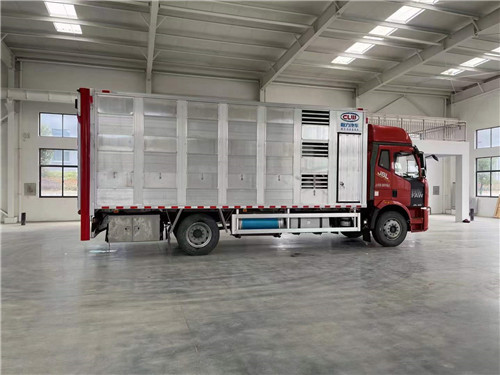 國(guó)六解放鋁合金運(yùn)豬車(chē)箱體采用高強(qiáng)度鋁合金專(zhuān)業(yè)定制型材拼裝焊接而成,整車(chē)三層,每層3個(gè)欄位,共9個(gè)欄位,每欄配2個(gè)鴨嘴式飲水嘴和2個(gè)噴霧頭,內(nèi)部的地板可翻起,頂部的天花板可以翻起(可選裝自動(dòng)頂升),方便人員進(jìn)出各個(gè)欄位,裝卸豬,進(jìn)行沖洗,車(chē)廂前部配備9個(gè)送風(fēng)風(fēng)機(jī),后部配備6個(gè)排風(fēng)風(fēng)機(jī),共15個(gè),進(jìn)行每層的交替吹風(fēng),配備雙溫機(jī)組,調(diào)節(jié)廂內(nèi)溫度,配備空氣過(guò)濾,車(chē)尾部整體液壓升降平臺(tái),廂內(nèi)帶監(jiān)控?cái)z像頭和溫度探頭,可實(shí)時(shí)監(jiān)控!
