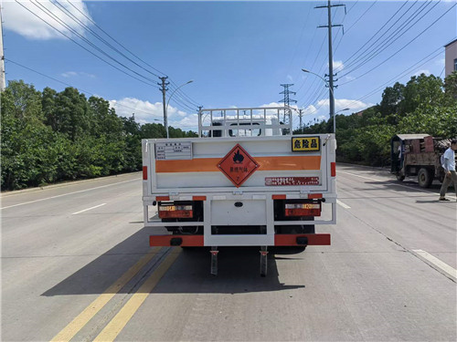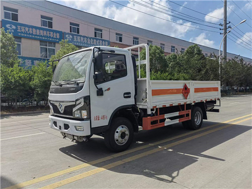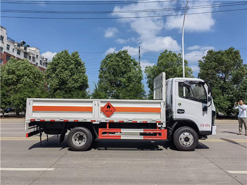 國六東風4.2米藍牌氣瓶運輸車倉欄配置:嚴格按照公告尺寸制作,邊2底3材質,帶可卸式高欄,底板上鋪靜電膠皮,配備滅火器,三角頂燈,靜電拖帶等,嚴格按照國家危險品法規進行“易燃氣體”標識粘貼等。