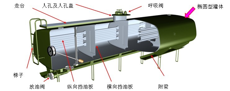 罐內部設有橫向、縱向隔板,減輕汽車行駛加速及減速時罐內液體的波動。