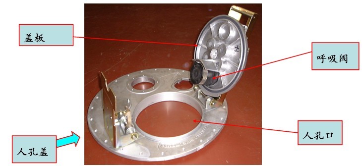(4)罐體部分---人孔蓋:人孔蓋由螺栓緊固在罐口頸板上,蓋板安裝有呼吸閥。呼吸閥一般為外購產品.