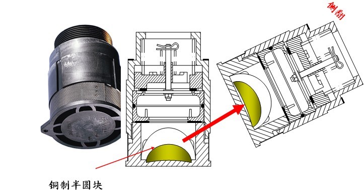 側翻:•傾翻時的密封 - 在正常情況下, 銅質半圓重塊位于閥底部,傾翻時重塊在重量作用下翻動, 封住閥口
