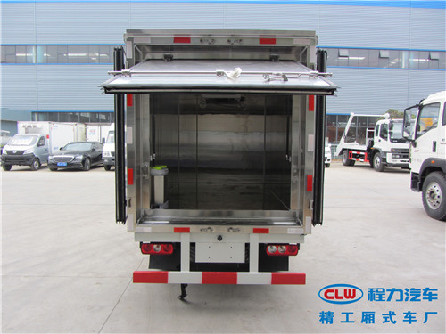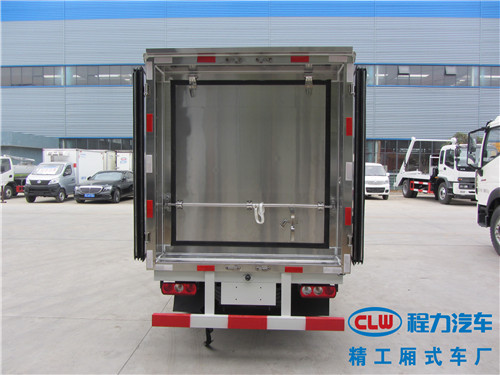 改裝要求:廂體采用內不銹鋼外玻璃鋼制作,中間8公分厚保溫板,紫外線消毒燈、噴霧消毒,雙后門,廂體密封無泄漏,裝配零下五度制冷機組,其余標配。