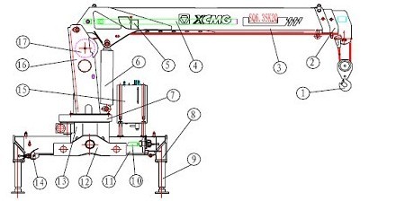 1、吊鉤組件 2、伸縮臂(二節) 3、基本臂 4、伸縮油缸 5、幅度指示器 6、變幅油缸 7、回轉支承 8、活動支腿 9、垂直支腿油缸 10、水平支腿油缸 11、固定支腿 12、支架 13、回轉底座 14、操縱機構 15、液壓油箱 16、轉臺 17、起升機構