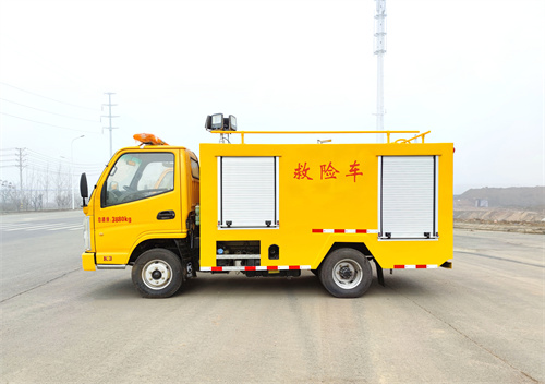 凱馬藍牌救險車,總質量3880kg,5開門,內置大功率發動機,全方位照明燈,便攜式潛水泵,救生繩,救生衣,滅火器等設備。