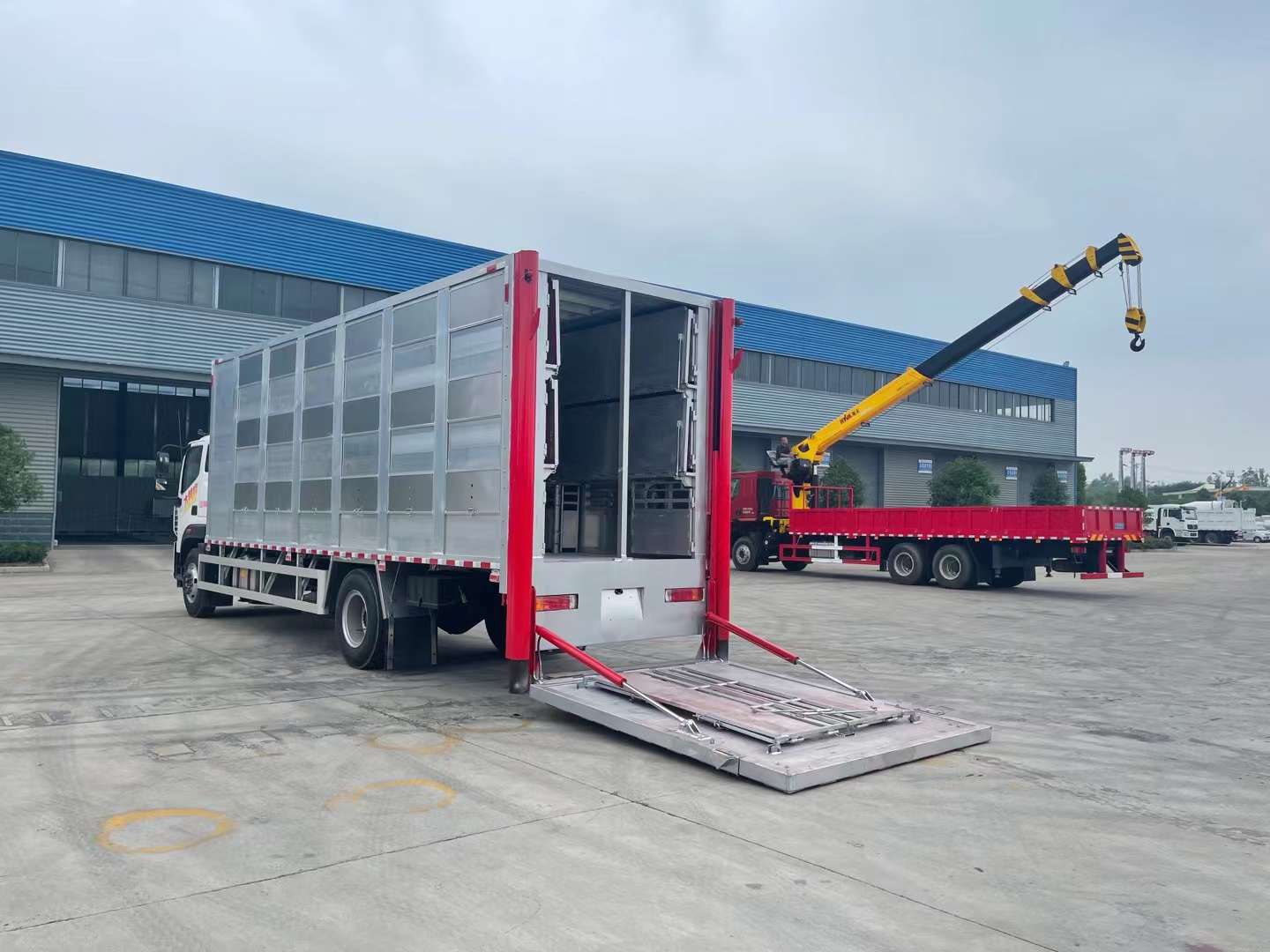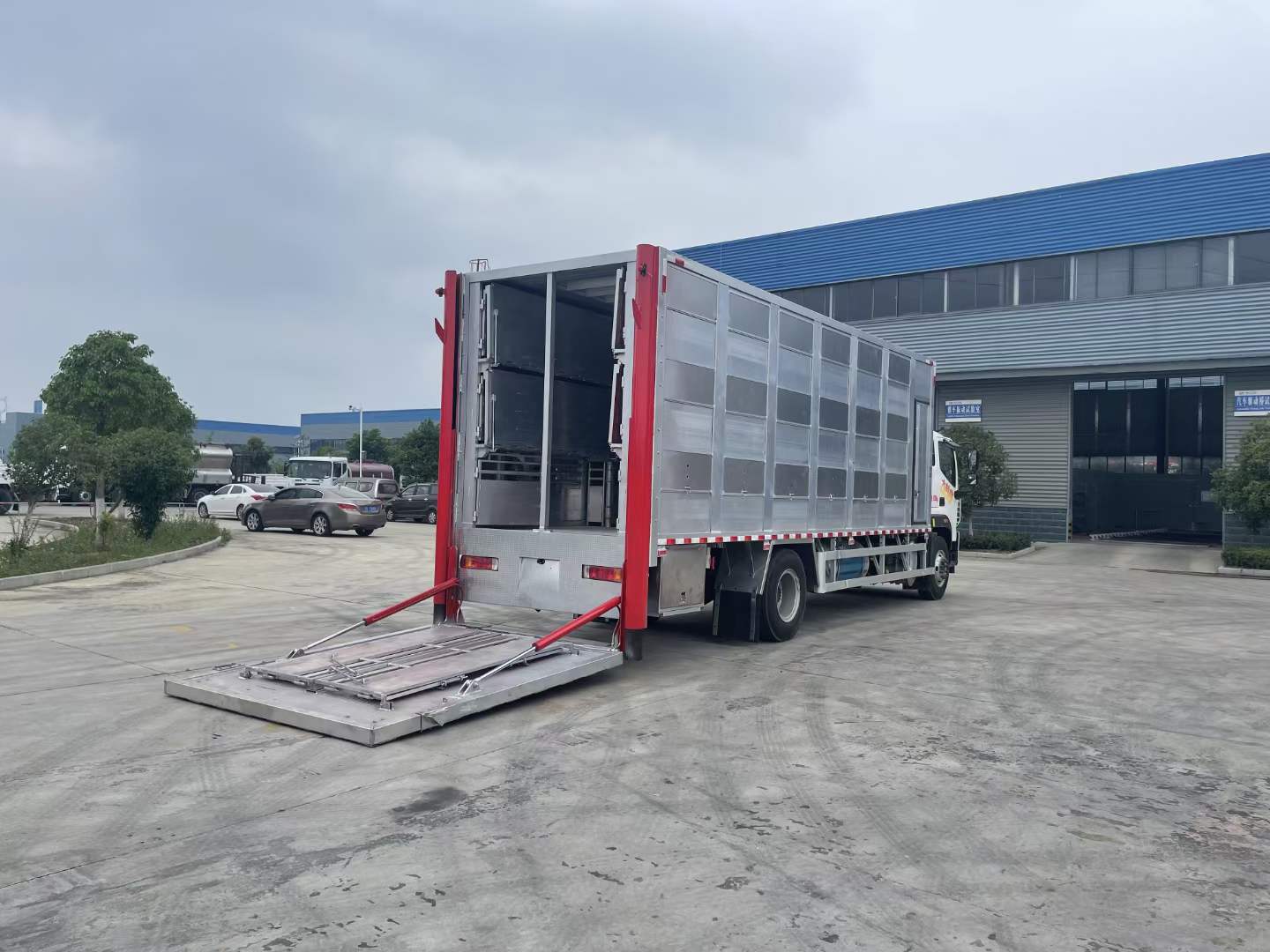 福田奧鈴單橋畜禽運(yùn)輸車,玉柴245馬力發(fā)動機(jī),法士特8檔變速箱,5750mm軸距,電動玻璃,中控室,遙控鑰匙,空調(diào),廂體長度7.7米,箱體采用高強(qiáng)度鋁合金專業(yè)定制型材拼裝焊接而成,整車三層,每層3個欄位,共9個欄位,每欄配2個鴨嘴式飲水嘴和2個噴霧頭,內(nèi)部的地板可翻起,頂部的天花板可以翻起(可選裝自動頂升),方便人員進(jìn)出各個欄位,裝卸豬,進(jìn)行沖洗,車廂前部配備9個送風(fēng)風(fēng)機(jī),后部配備6個排風(fēng)風(fēng)機(jī),共15個,進(jìn)行每層的交替吹風(fēng),配備雙溫機(jī)組,調(diào)節(jié)廂內(nèi)溫度,配備空氣過濾,車尾部整體液壓升降平臺,廂內(nèi)帶監(jiān)控攝像頭和溫度探頭,可實(shí)時監(jiān)控。環(huán)保?燃油齊全