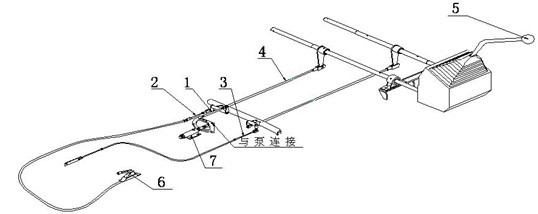 1 、油泵變量桿 2 、駕駛室操縱軟軸 3、 油門拉線 4 、油泵控制推拉桿 5、 操縱手柄 6、 室內(nèi)操縱 7 、定位裝置