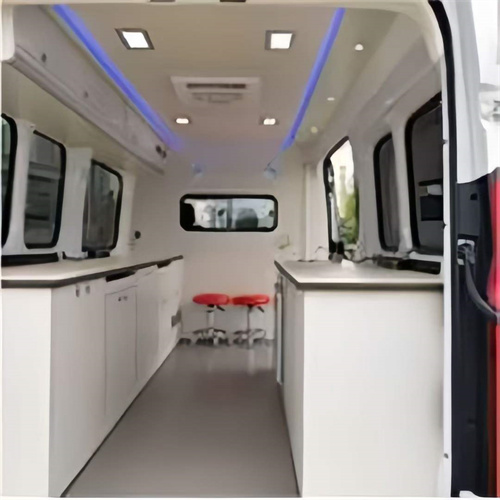 大通V90醫療車(可選牙科車、DR車、醫療車)整車尺寸(mm):5940*2110*2755/3020 軸距(mm):3760 載客人數:2-3人 2.0T 柴油發動機 110KW/130KW可選 6速手動擋/8速自動擋可選 前置后驅 195/75R16LT后雙胎 ABS+EBD+BAS 中控鎖 電動門窗 多功能方向盤 后艙頂置空調 艙內照明燈 逆變器 多功能插座 工作臺 車頂吊柜 可選裝:牙椅 DR設備等 更多個性化要求可定制。