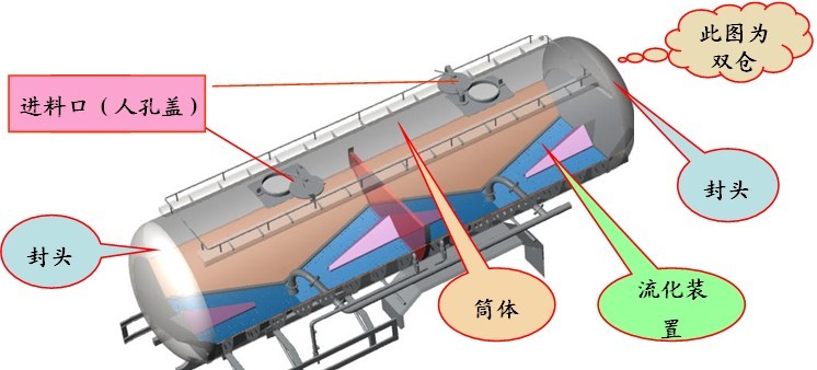 臥式罐體由中間圓柱筒、兩個封頭焊合而成,上部設有進料口(即人孔),焊有工作平臺,下部與底架焊合,罐內有流化裝置。罐體可以分為兩倉、三倉;每個艙的氣室是不同,前后艙是可以獨立卸料的。
