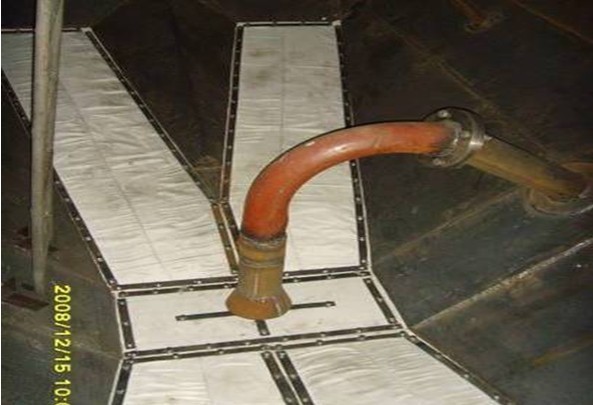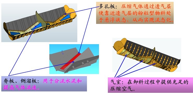 多孔板和側溜板與水平面成一定角度的夾角。流化布用螺栓壓緊在多孔板上。流化布下面形成封閉的氣室,各個艙的氣室是不相通的,前后艙可以獨立卸料。